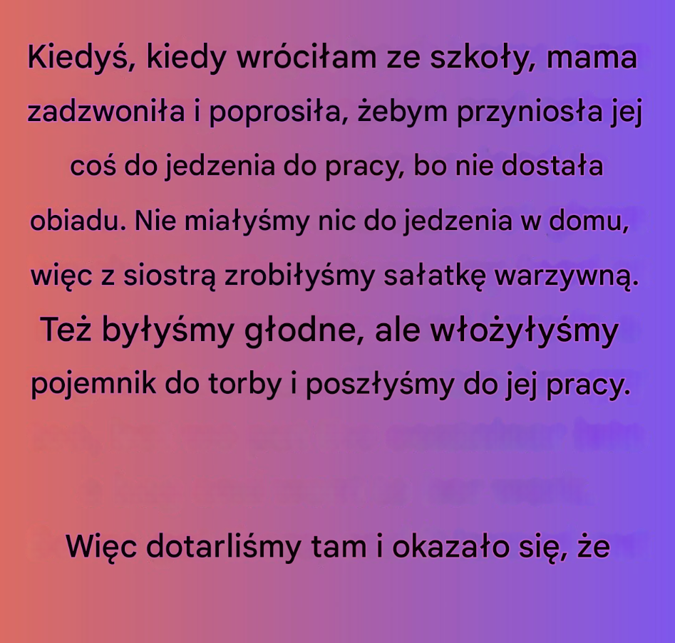 Kiedy tam dotarliśmy, zastaliśmy ją w pokoju socjalnym z koleżanką z pracy, miłą kobietą o imieniu pani Danika. Pani Danika miała około 55 lat i cichy głos. Pocierała głowę, wyglądając na zmęczoną. Twarz mojej mamy rozjaśniła się na nasz widok, ale jej wzrok szybko przesunął się na pojemnik z sałatką.